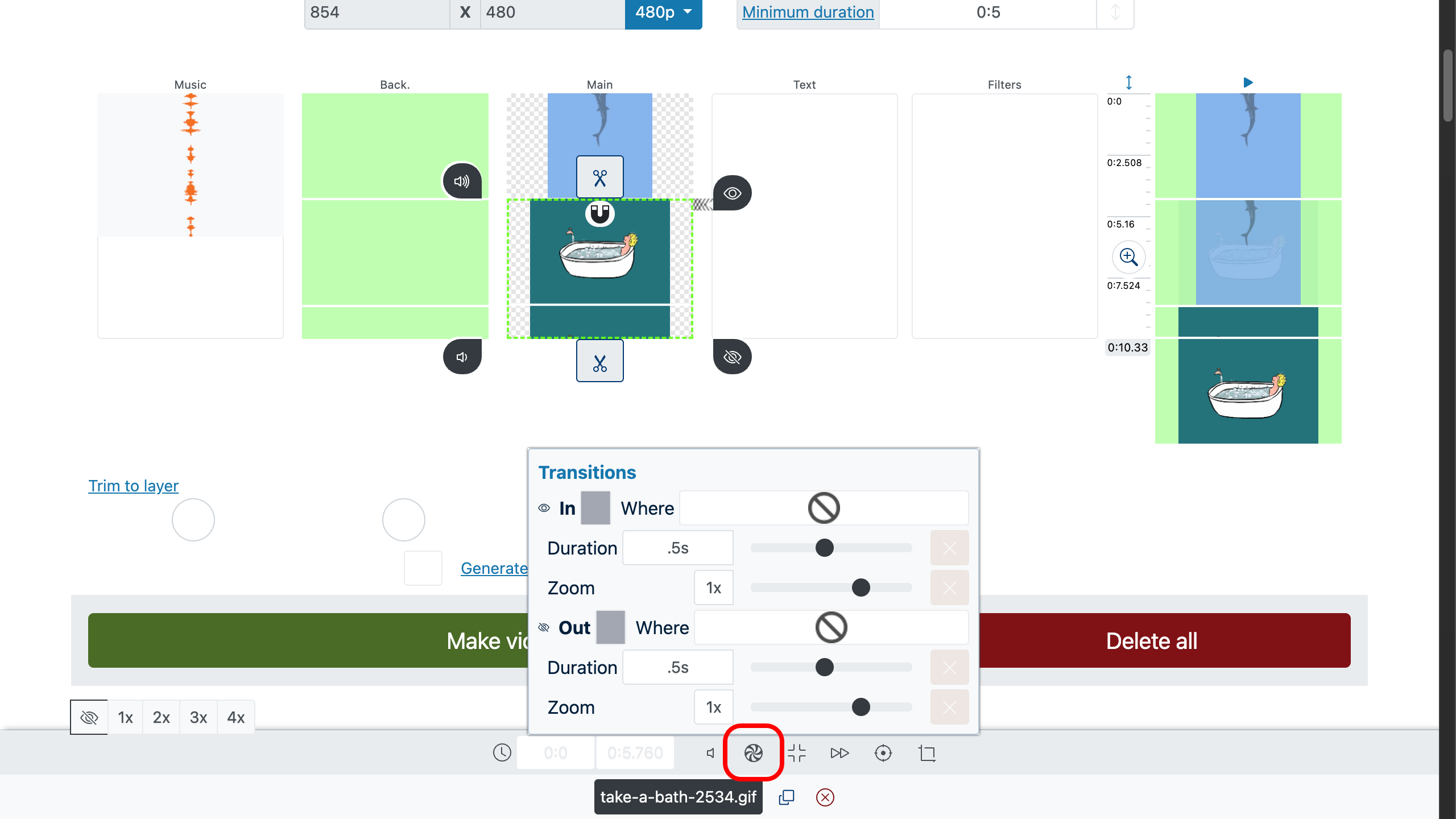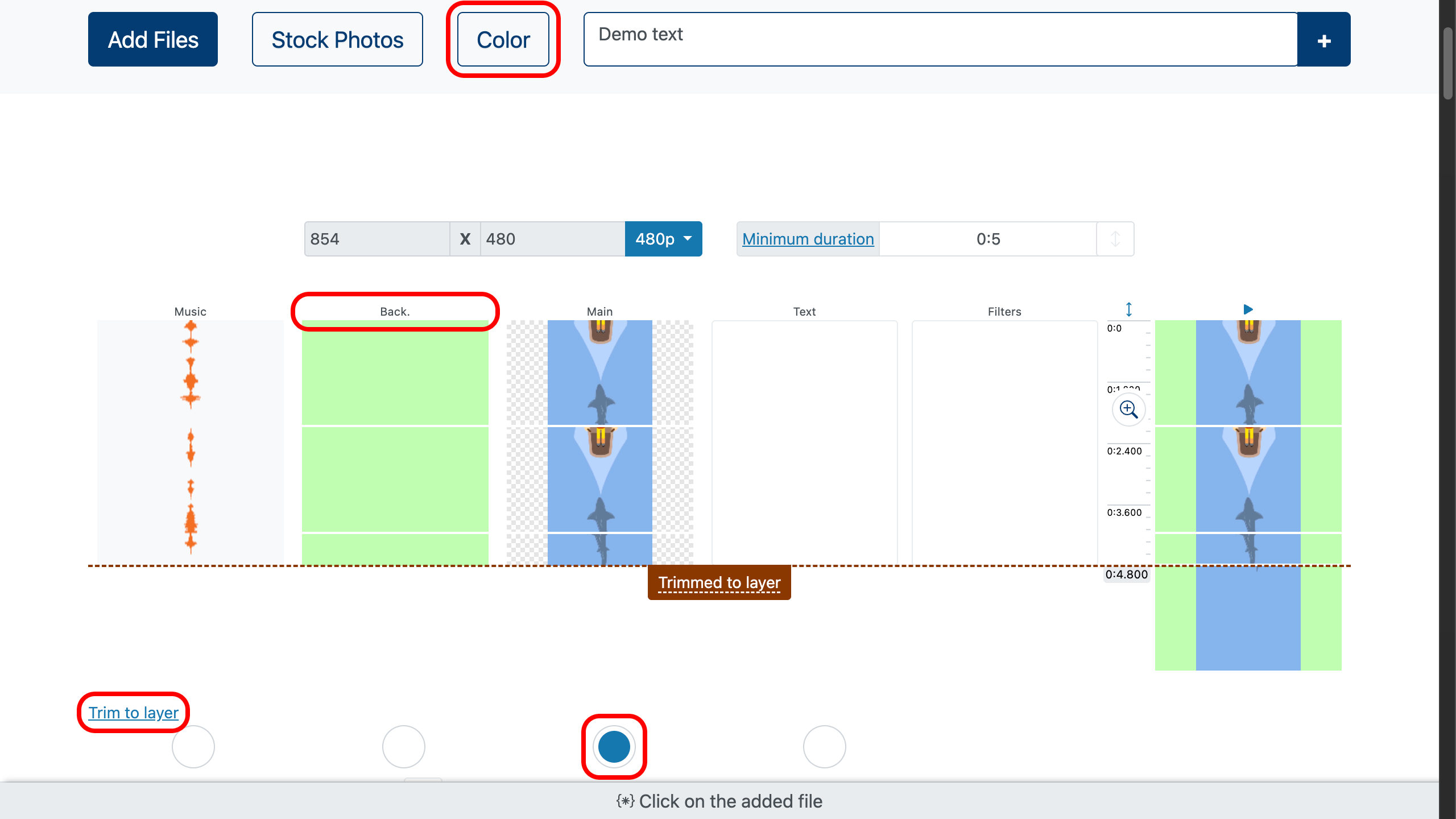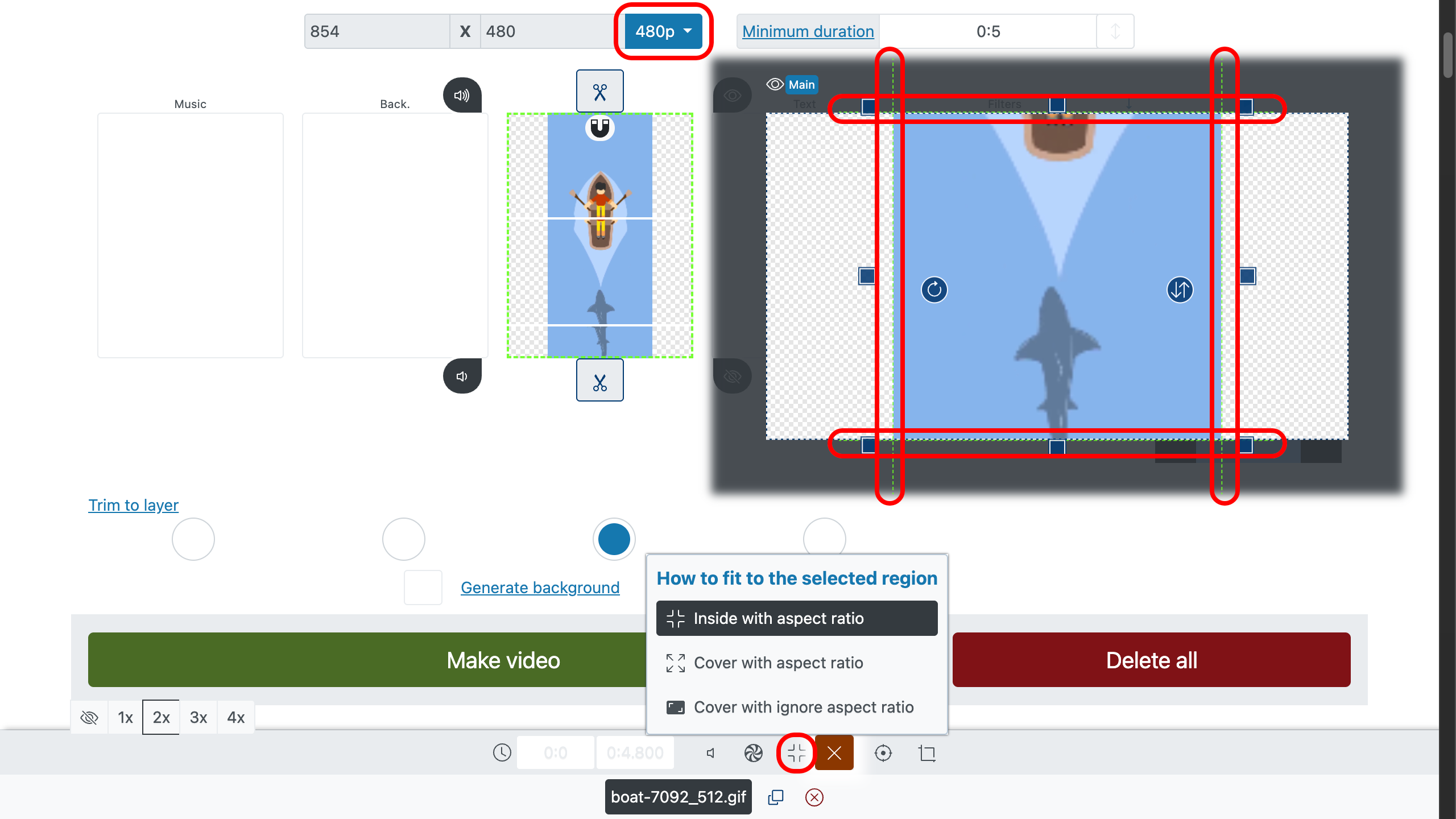 背景に色を付けるには、色レイヤーをGIFの下に配置します。次にGIFトラックで “crop to layer” を有効にすると、動画メーカーが自動的にすべての レイヤーをGIFに揃えます。