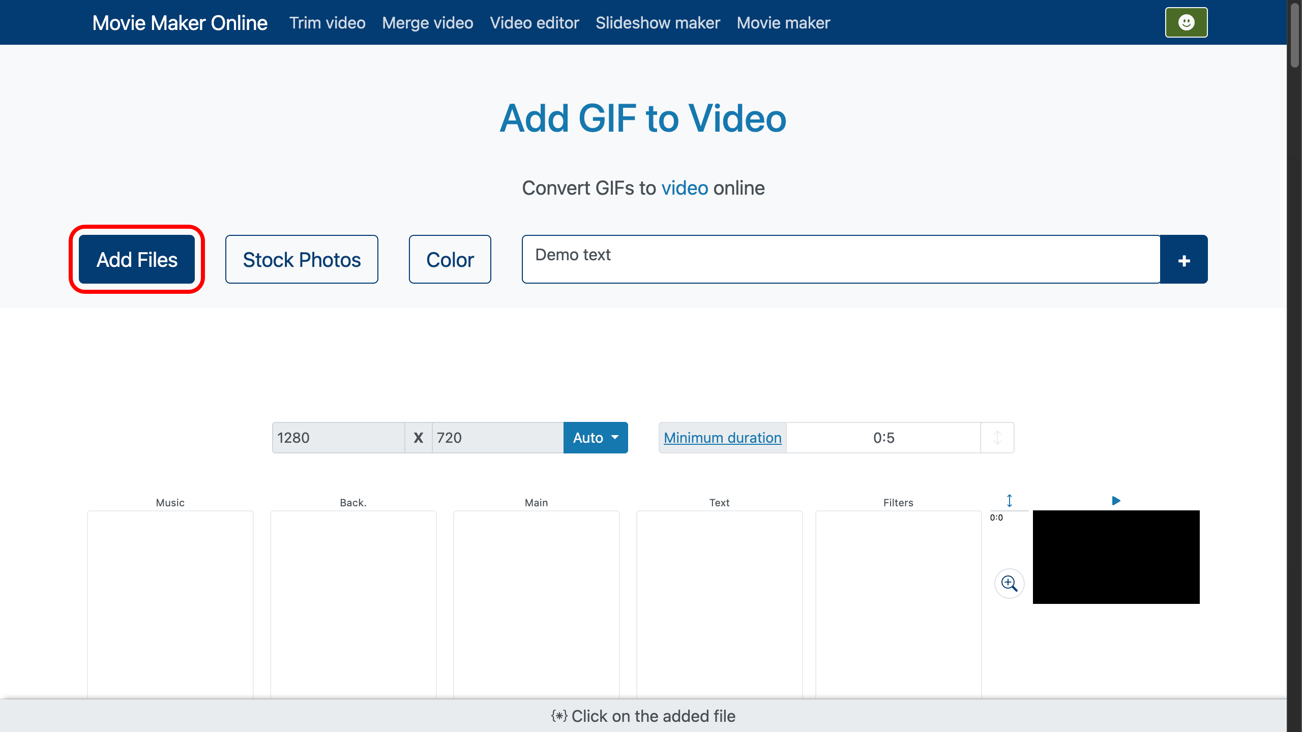 任意のデバイス(iPhone、Mac、PC、Android)でブラウザーから無料の動画エディターを開きます。 GIFをアップロードエリアへドラッグ&ドロップするか、ディスクから選択します。JPG、PNG、音楽ファイルなど他のメディアにも対応しています。